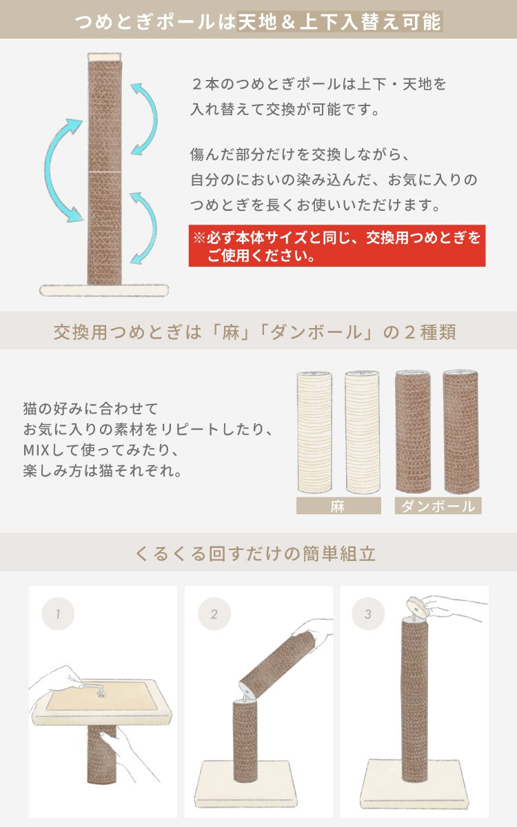 2本のつめとぎポールは上下・天地を入れ替えて交換が可能です。また、別売りで専用の交換用つめとぎがございます。