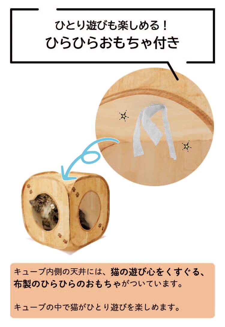 キューブ内側の天井には布製のひらひらのおもちゃがついています。キューブの中で猫がひとり遊びを楽しむこともできます。
