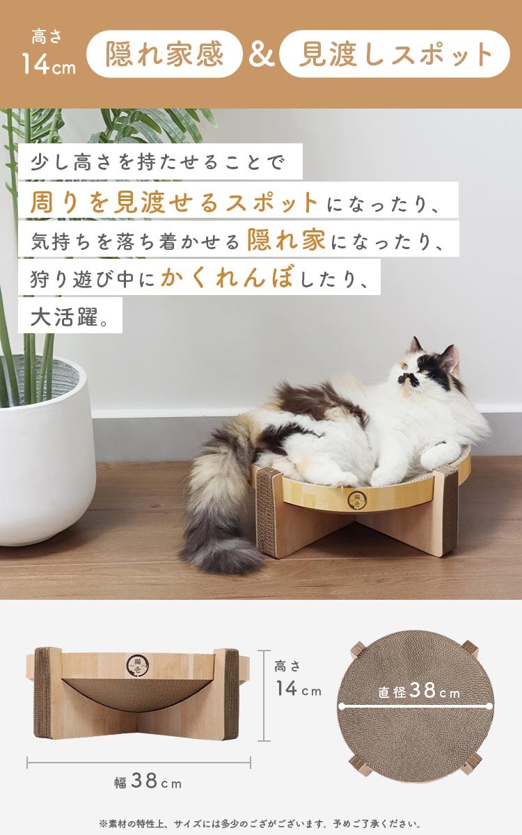●猫壱のバリバリボウルは猫のからだにフィットする丸型&すり鉢構造なので、ベッドとしてくつろいだり、爪とぎするのにピッタリ!柄はシンプルな美しい木目調を採用しインテリアに調和します。