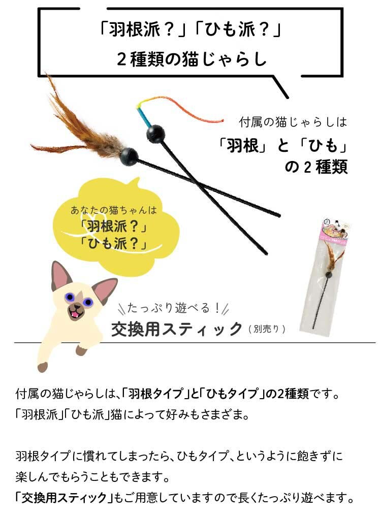 ●羽毛スティックは目のよくない猫ちゃんにも見えやすいように自然な白黒カラー。シートの柄は明るい色調のお菓子柄に一新。遊び時間をより楽しく演出します。