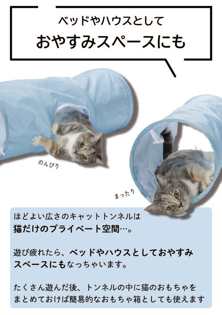 ほどよい広さなので、ベッドやハウスとしておやすみスペースにしたり、たくさん遊んだ後、トンネルの中に猫のおもちゃをまとめておけば簡易的なおもちゃ箱として使えたり・・・遊び方も使い方もいろいろ。