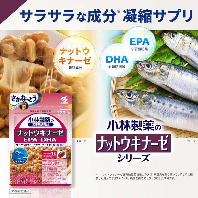 ●小林製薬のナットウキナーゼ EPA DHA サプリメントは、中高年の健康維持に役立つナットウキナーゼサプリ。