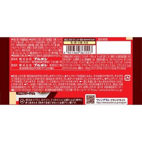 | 大豆たんぱく(国内製造)、砂糖、ショートニング、小麦たんぱく、ファットスプレッド(乳成分を含む)、大豆パフ、水飴、ココアパウダー、液卵黄(卵を含む)、植物油脂、全粉乳、乳糖、カカオマス、ぶどう糖、食塩/ソルビトール、グリセリン、炭酸Ca、乳化剤(大豆由来)、ロイシン、トレハロース、バリン、イソロイシン、香料(乳由来)、V.E、ナイアシン、パントテン酸Ca、ピロリン酸第二鉄、V.B1、V.B2、V.B6、V.A、葉酸、着色料(アナトー)、V.D、V.B12 |