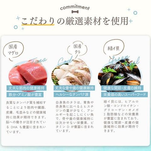 ●ヘルシーでアレルゲンになりにくい良質なタンパク源、国産マグロ・国産タラを使用。