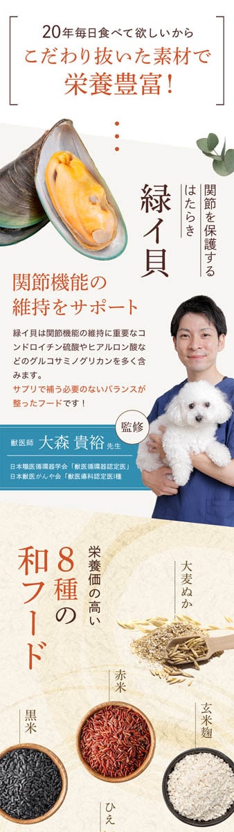 肉類(鶏肉、馬肉、鶏レバー)、大麦、玄米、鰹節、大麦ぬか、ビール酵母、米油、卵黄粉末、マグロ、黒米、赤米、イヌリン(水溶性食物繊維)、コラーゲンペプチド、発酵調味液、玄米麹、はと麦、あわ、きび、ひえ、フラクトオリゴ糖、昆布、大根葉、ごぼう、人参、緑イ貝、乳酸菌、DHA含有精製魚油粉末、セレン酵母、キャベツ、ブロッコリー、かぼちゃ、むらさきいも、さつまいも、あかもく、わかめ、白菜、高菜、パセリ、青じそ、タウリン、L-トレオニン、ミネラル類(リン酸三カルシウム、塩化ナトリウム、塩化カリウム、グルコン酸亜鉛、ピロリン酸第二鉄、グルコン酸銅)、ビタミン類(ビタミンA、ビタミンD、ビタミンE、ビタミンB2、ビタミンB12、パントテン酸カルシウム)