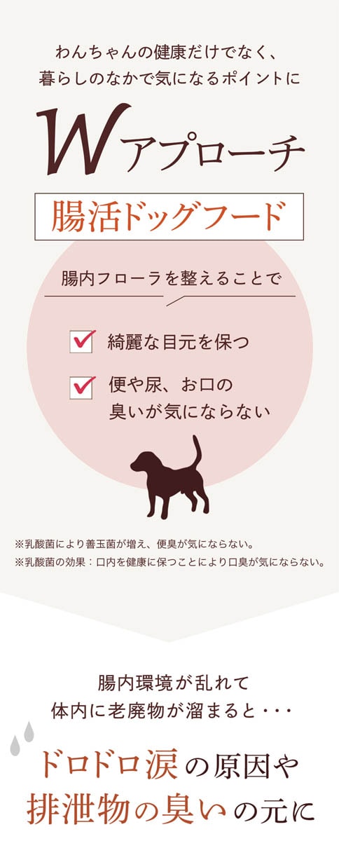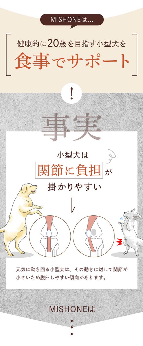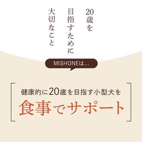 ずっと寄り添うフードで「ニ十歳を目指す」がコンセプトの小型犬向けプレミアムドッグフード。「HACCP認証」や 品質保証の「ISO22005認証」を取得した国内工場製造のヒューマングレード品質、合成添加物不使用の総合栄養食。