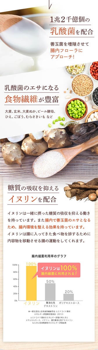 ・1袋に1兆2000億個の乳酸菌(FK23)配合により、腸内フローラを整えることが期待できる。