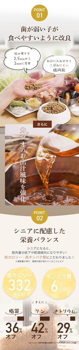 ●従来品小型犬用フードの特長はそのままにシニア犬に嬉しい成分や特長を追加。