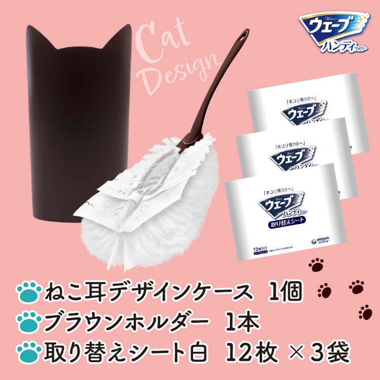 ●猫耳収納ケースとハンディワイパー本体、取替シート12枚×3袋入り。