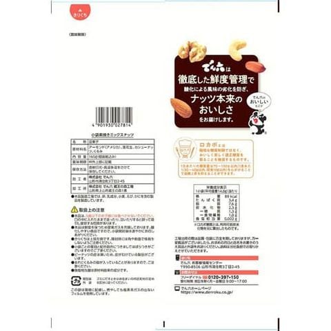 | 1小袋(平均重量14.0g)当たり 熱量:89kcal、たんぱく質:3.4g、脂質:7.6g、炭水化物:2.3g(糖質:1.3g、食物繊維:1.0g)、食塩相当量:0.002g |