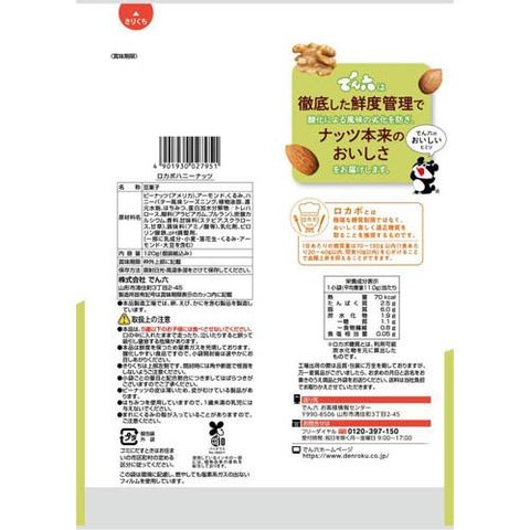 | ピーナッツ(アメリカ)、アーモンド、くるみ、ハニーバター風味シーズニング、植物油脂、還元水飴、はちみつ、蛋白加水分解物/トレハロース、糊料(アラビアガム、プルラン)、炭酸カルシウム、香料、甘味料(ステビア、スクラロース、甘草)、調味料(アミノ酸等)、乳化剤、ピロリン酸鉄、pH調整剤、(一部に乳成分、小麦、落花生、くるみ、アーモンド、大豆を含む) |