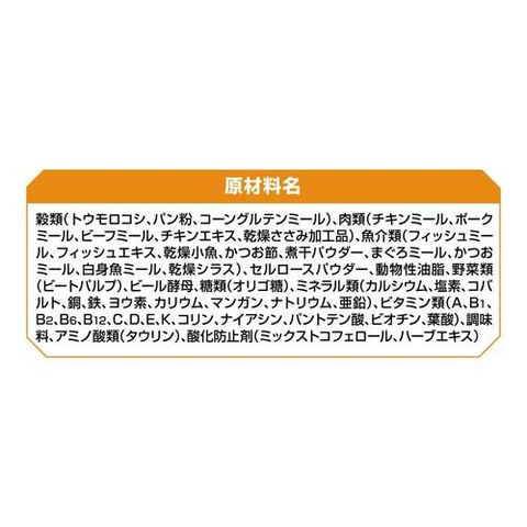 | 穀類(トウモロコシ、パン粉、コーングルテンミール)、肉類(チキンミール、ポークミール、ビーフミール、チキンエキス、乾燥ささみ加工品)、魚介類(フィッシュミール、フィッシュエキス、乾燥小魚、かつお節、煮干パウダー、まぐろミール、かつおミール、白身魚ミール、乾燥シラス)、セルロースパウダー、動物性油脂、野菜類(ビートパルプ)、ビール酵母、糖類(オリゴ糖)、ミネラル類(カルシウム、塩素、コバルト、銅、鉄、ヨウ素、カリウム、マンガン、ナトリウム、亜鉛)、ビタミン類(A、B1、B2、B6、B12、C、D、E、K、コリン、ナイアシン、パントテン酸、ビオチン、葉酸)、調味料、アミノ酸類(タウリン)、酸化防止剤(ミックストコフェロール、ハーブエキス) |