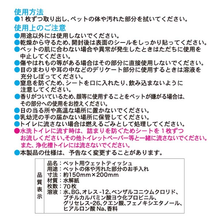 ・1枚ずつ取り出し、ペットの体や汚れた部分を拭いてください。