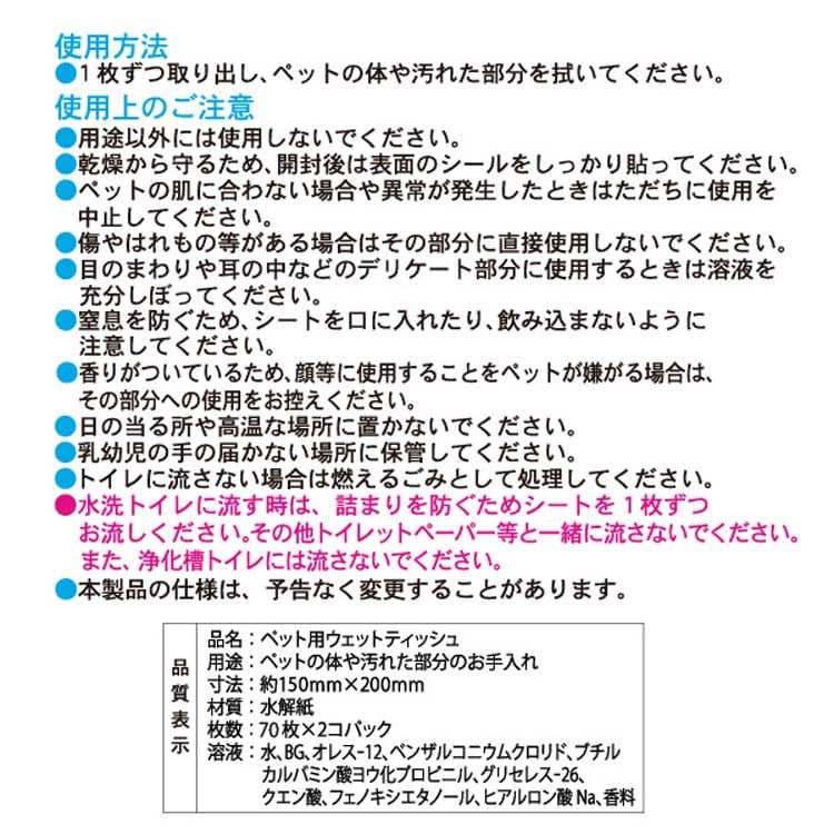 ・1枚ずつ取り出し、ペットの体や汚れた部分を拭いてください。