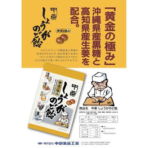 | 水飴(国内製造)、砂糖、黒糖、生姜粉末、はちみつ、甘草エキス、食塩 |