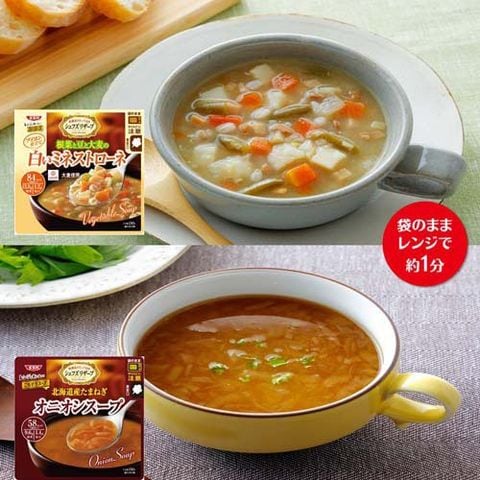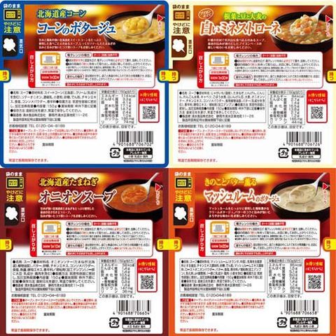 | 白いミネストローネ2袋、コーンのポタージュ2袋、マッシュルームのポタージュ2袋、オニオンスープ2袋 |
