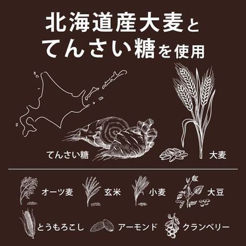 | コーングリッツ(国内製造、分別生産流通管理済み)、てんさい糖(てんさい(北海道産))、オートミール(国内製造)、全粒大麦(北海道産)、アーモンド、難消化性デキストリン、ドライクランベリー、ココアパウダー、玄米(北海道産)、全粒小麦(北海道産)、大豆(北海道産)、カカオマス、オリゴ糖含有てんさい糖蜜(てんさい(北海道産))、ココアバター、食塩、キャラメルパウダー(乳成分を含む)、麦芽エキス/グリセリン、乳化剤、酸化防止剤(ビタミンE) |