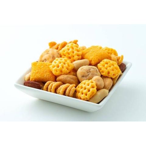| ローストピーナッツ(落花生(中国)、植物油脂、食塩)、粉巻きガルバンソー(ガルバンソー、小麦粉、砂糖、寒梅粉ミックス(でん粉、もち米)、でん粉、植物油脂、食塩)、パスタスナックチーズ味(小麦粉、植物油脂(大豆を含む)、チーズシーズニング(乳成分を含む))、六角チーズスナック(米、でん粉、植物油脂、食塩、砂糖、チーズパウダー、マーガリン、粉糖、唐辛子、たん白加水分解物)、アーモンド、カシューナッツ、黒こしょうジャイアントコーン(ジャイアントコーン、植物油脂、小麦粉、寒梅粉ミックス(でん粉、もち米)、でん粉、砂糖、でん粉分解物、食塩、チキンエキス(ごま・鶏肉・豚肉を含む)、こしょう)、濃厚チーズインスナック(油脂加工食品、小麦粉、植物油脂、コーングリッツ、砂糖、チーズシーズニング、チーズパウダー、小麦ファイバー、食塩、酵母エキスパウダー)、植物油脂、チーズパウダー、チーズシーズニング、食塩、乳等を主要原料とする食品/加工デンプン、調味料(アミノ酸等)、トレハロース、香料(小麦・乳由来)、膨張剤、乳化剤(大豆由来)、着色料(パプリカ色素、アナトー色素、クチナシ色素)、炭酸カルシウム、酸味料、甘味料(ステビア、スクラロース) |