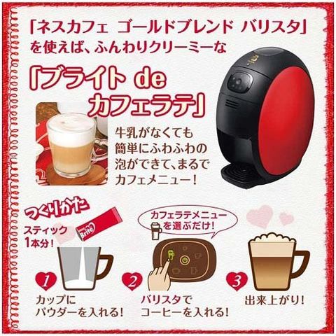 ●ブライトとネスカフェ ゴールドブレンド バリスタを使えば、牛乳が無くても簡単にふわふわ泡立つラテ系メニューが楽しめます。