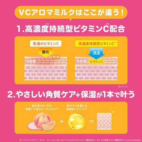 ●ビタミンC※1&肌を柔らかくする角質ケア成分ピーチエキス※2が配合。