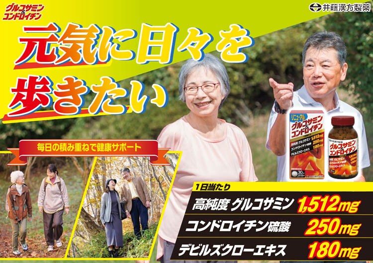 ●高純度グルコサミン塩酸塩1512mg、コンドロイチン硫酸250mg、デビルズクローエキス180mg配合(1日当たり)。