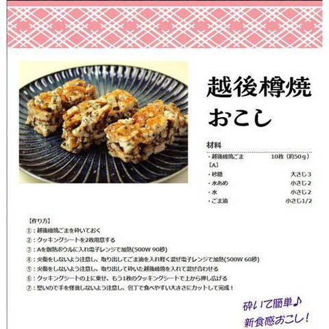| 米(豪州産、タイ産、その他)、ごま、しょうゆ(小麦・大豆を含む)、砂糖、デキストリン、粉末しょうゆ(小麦・大豆を含む)、でん粉/加工でん粉、調味料(アミノ酸等)、カラメル色素 |