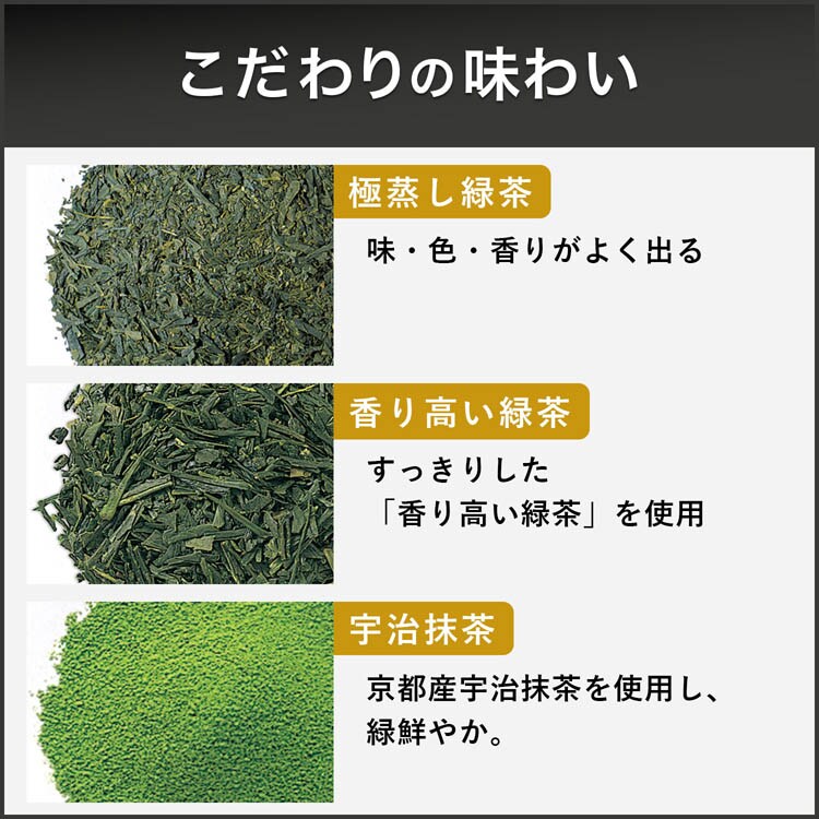●香りに優れた原料を選定すっきりした「香り高い緑茶」に、緑鮮やかな「抹茶」を贅沢に加えて仕上げました。香り高く、深みのある味わいをお楽しみいただけます。