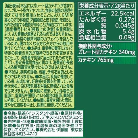 届出表示:本品にはガレート型カテキンが含まれます。ガレート型カテキンには、食事の脂肪の吸収を抑えて排出を増加させることにより、BMIが高めの方の体脂肪(内臓脂肪と皮下脂肪)を減らし、BMIを改善する機能があることが報告されています。