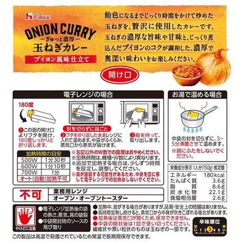 | 玉ねぎ、砂糖混合ぶどう糖果糖液糖、牛脂豚脂混合油、小麦粉、ソテーオニオン、玉ねぎ加工品、カレーパウダー、乾燥玉ねぎ、食塩、みそ、トマトペースト、チキンブイヨン、でんぷん、ガーリックペースト、香辛料、ぶどう糖、オニオンパウダー、酵母エキス加工品、チーズパウダー/調味料(アミノ酸等)、カラメル色素、酸味料、乳酸Ca、香料、酸化防止剤(ビタミンE)、(一部に乳成分・小麦・大豆・鶏肉・豚肉を含む) |