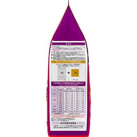 | ・ドライフード:穀類(小麦粉、トウモロコシ、コーンフラワー、小麦ブラン、コーングルテンミール、ライスブラン)、肉類(チキンミール、チキンレバーパウダー)、油脂類(動物性油脂、植物性油脂(オメガ-6脂肪酸含む))、魚介類(フィッシュエキスパウダー、マリンコラーゲン、小魚粉末(DHA、EPA/オメガ-3脂肪酸源))、ビール酵母(β-グルカン源)、乳酸菌加熱菌体、コエンザイムQ10、糖類(オリゴ糖、エリスリトール)、カゼインホスホペプチド、果実類(クランベリーパウダー、ブルーベリーパウダー(アントシアニン源))、トマト(リコピン源)、L-カルニチン、ミネラル類(カルシウム、リン、カリウム、クロライド、鉄、銅、マンガン、グルコン酸亜鉛、硫酸亜鉛、ヨウ素、コバルト)、ビタミン類(A、B2、B6、B12、D、E、パントテン酸、コリン)、酸化防止剤(ミックストコフェロール、ローズマリー抽出物)、バチルスサブチルス(活性菌)、アミノ酸類(アルギニン、タウリン、メチオニン)、グルコサミン、コンドロイチン、ヒアルロン酸 ・ビーフ味パウダー:肉類(ビーフエキスパウダー、チキンレバーパウダー)、きな粉、野菜類(カボチャパウダー、コマツナパウダー、ニンジンパウダー、ホウレンソウパウダー)、穀物麹( 白米、大麦、赤米、玄米、 粟、 キビ、黒米 、タカキビ、ヒエ) ・チーズ味パウダー:チーズパウダー、きな粉、チキンレバーパウダー、野菜類(カボチャパウダー、コマツナパウダー、ニンジンパウダー、ホウレンソウパウダー)、穀物麹( 白米、大麦、赤米、玄米、 粟、 キビ、黒米 、タカキビ、ヒエ) |