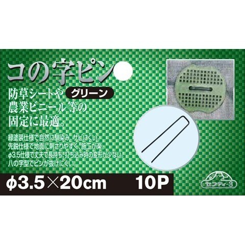 形状:コの字型。ピン長さ:20cm。ピン太さ:3.5mm。ピン肩幅:30mm。入数:10本。緑塗装仕様。(材質)スチール。