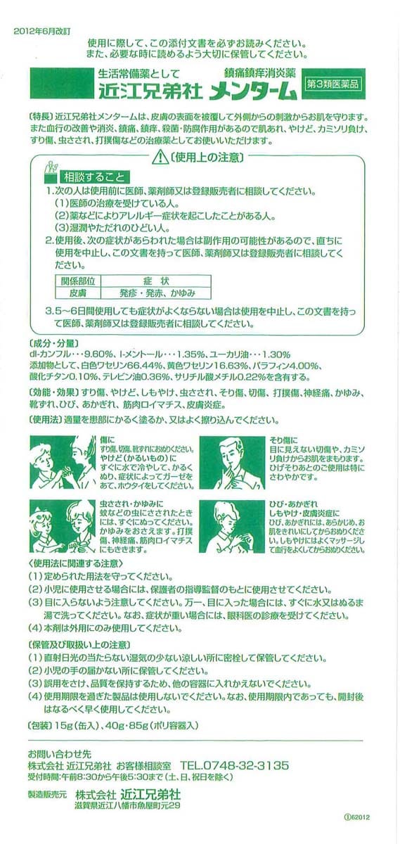 ●近江兄弟社メンタームは、皮膚の表面を被覆して外側からの刺激からお肌を守ります。また血行の改善や消炎、鎮痛、鎮痒、殺菌・防腐作用があるので肌あれ、やけど、カミソリ負け、すり傷、虫さされ、打撲傷などの治療薬としてお使いいただけます。