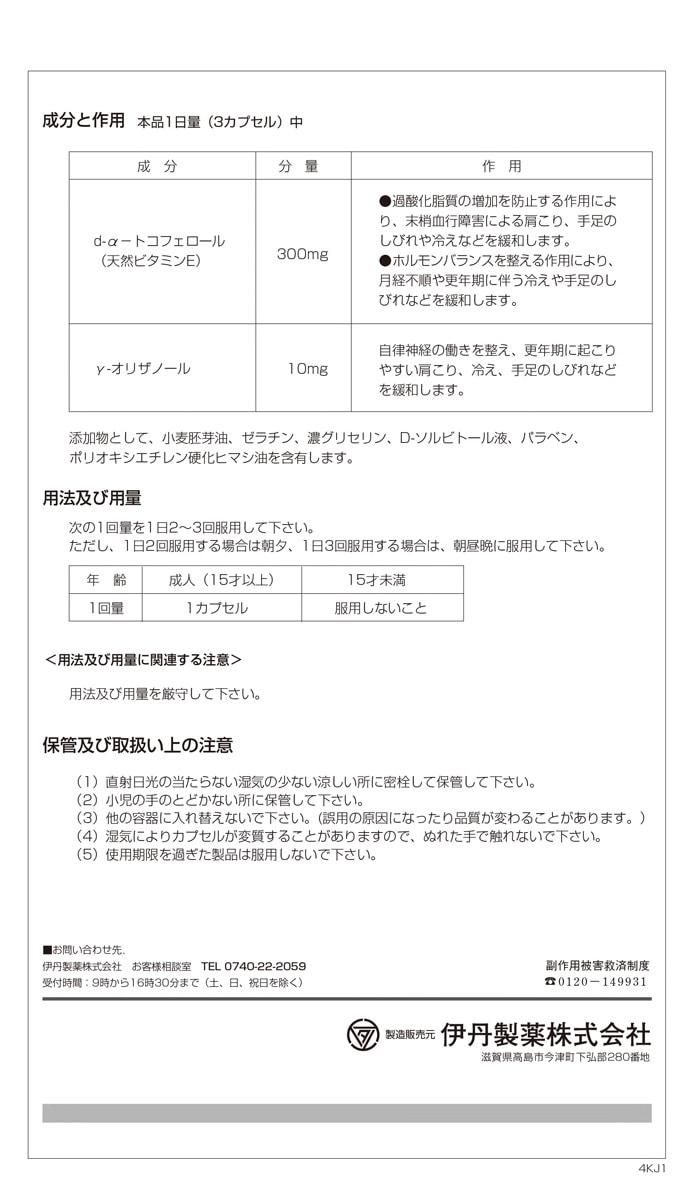 | 本品1日量(3カプセル)中 [成分:分量:作用] d-α-トコフェロール(天然ビタミンE):300mg:・過酸化脂質の増加を防止する作用により、末梢血行障害による肩こり、手足のしびれや冷えなどを緩和します。・ホルモンバランスを整える作用により、月経不順や更年期に伴う冷えや手足のしびれなどを緩和します。 γ-オリザノール:10mg:自律神経の働きを整え、更年期に起こりやすい肩こり、冷え、手足のしびれなどを緩和します。 添加物として、小麦胚芽油、ゼラチン、濃グリセリン、D-ソルビトール液、パラベン、ポリオキシエチレン硬化ヒマシ油を含有します。 |