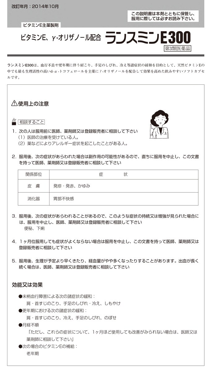 ●ランスミンE300は、血行不良や更年期に伴う肩こり、手足のしびれ、冷え等諸症状の緩和を目的として、天然ビタミンEの中でも最も生理活性の高いd-α-トコフェロールを主薬にγ-オリザノールを配合して効果を高めた飲みやすいソフトカプセルです。