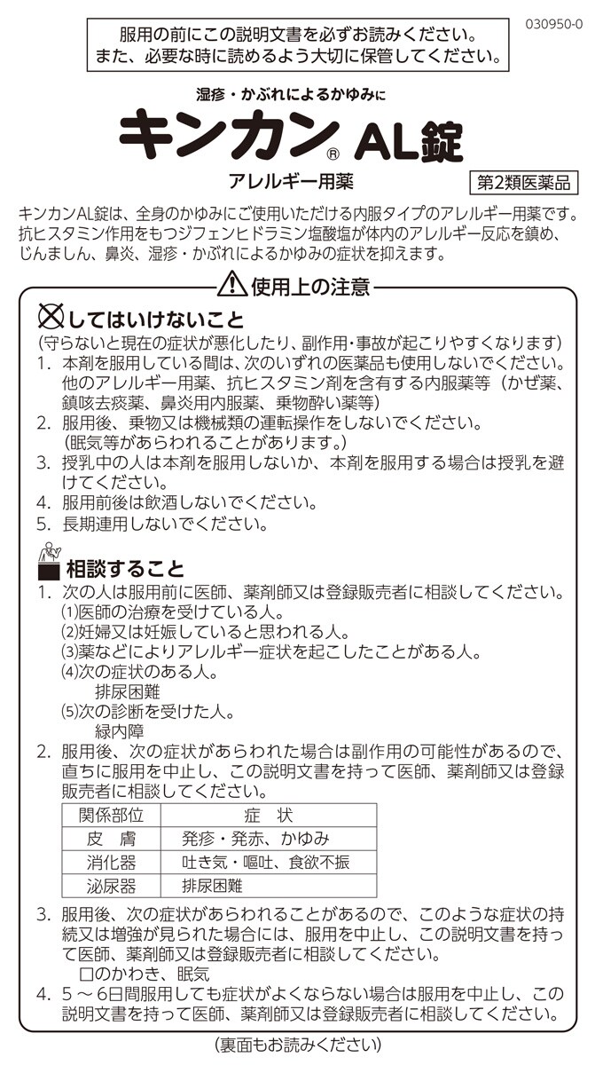●キンカンAL錠は、全身のかゆみにご使用いただける内服タイプのアレルギー用薬です。