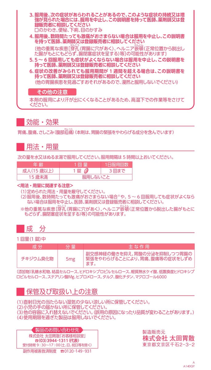 | 1回量(1錠)中 [成分:分量:主な作用] チキジウム臭化物:5mg:副交感神経の働きを抑え、胃酸の分泌を抑制しつつ胃腸の緊張をやわらげることにより、胃痛、腹痛等の症状をしずめます。 (添加物)乳糖水和物、結晶セルロース、ヒドロキシプロピルセルロース、軽質無水ケイ酸、低置換度ヒドロキシプロピルセルロース、ステアリン酸Mg、ヒプロメロース、タルク、酸化チタン、マクロゴール6000 |