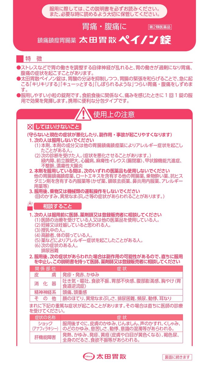 4.服用後、数時間たっても激痛がおさまらない場合は服用を中止し、説明書を持って医師、薬剤師又は登録販売者に相談してください。