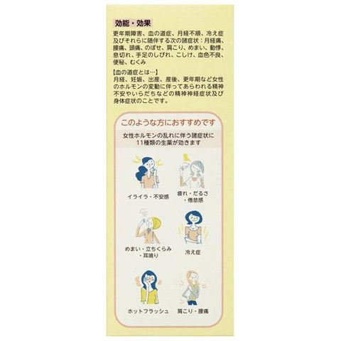 | 更年期障害、血の道症、月経不順、冷え症及びそれらに随伴する次の諸症状:月経痛、腰痛、頭痛、のぼせ、肩こり、めまい、動悸、息切れ、手足のしびれ、こしけ、血色不良、便秘、むくみ (血の道症とは・・・) 月経、妊娠、出産、産後、更年期など女性のホルモンの変動に伴ってあらわれる精神不安やいらだちなどの精神神経症状及び身体症状のことです。 |