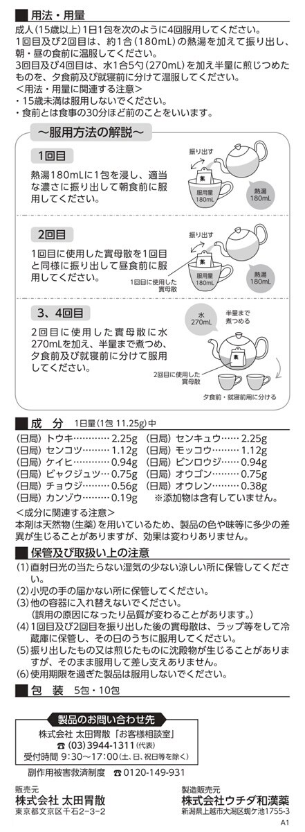 | 1日量(1包11.25g)中 (日局)トウキ:2.25g (日局)センキュウ:2.25g (日局)センコツ:1.12g (日局)モッコウ:1.12g (日局)ケイヒ:0.94g (日局)ビンロウジ:0.94g (日局)ビャクジュツ:0.75g (日局)オウゴン:0.75g (日局)チョウジ:0.56g (日局)オウレン:0.38g (日局)カンゾウ:0.19g ※添加物は含有していません。 ★成分に関連する注意 本剤は天然物(生薬)を用いているため、製品の色や味等に多少の差異が生じることがありますが、効果は変わりありません。 |
