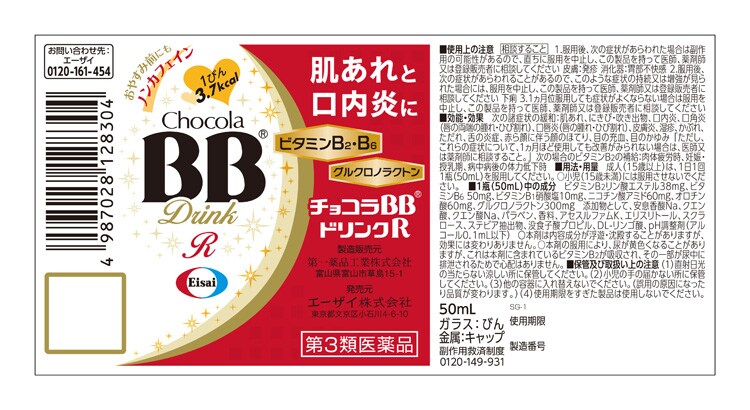 | 1瓶(50mL)中の成分 ビタミンB2リン酸エステル:38mg、ビタミンB6:50mg、ビタミンB1硝酸塩:10mg、ニコチン酸アミド60mg、オロチン酸:60mg、グルクロノラクトン:300mg 添加物として、安息香酸Na、クエン酸、クエン酸Na、パラベン、香料、アセスルファムK、エリスリトール、スクラロース、ステビア抽出物、没食子酸プロピル、DL-リンゴ酸、pH調整剤(アルコール0.1mL以下) ・本剤は内容成分が浮遊・沈殿することがありますが、効果には変わりありません。 ・本剤の服用により、尿が黄色くなることがありますが、これは本剤に含まれているビタミンB2が吸収され、その一部が尿中に排泄されるためで心配はありません。 |