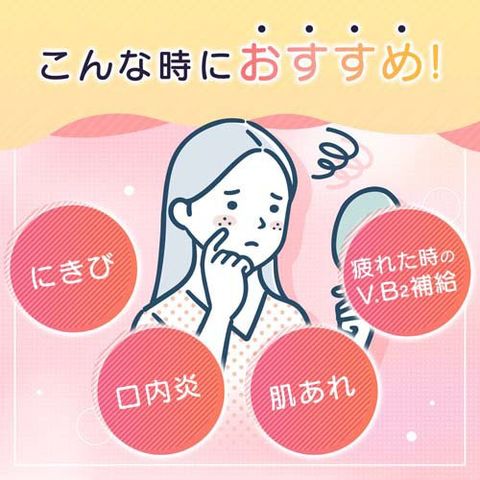 | 次の諸症状の緩和:肌あれ、にきび・吹き出物、口内炎、口角炎(唇の両端の腫れ・ひび割れ)、口唇炎(唇の腫れ・ひび割れ)、皮膚炎、湿疹、かぶれ、ただれ、舌の炎症、赤ら顔に伴う顔のほてり、目の充血、目のかゆみ「ただし、これらの症状について、1カ月ほど使用しても改善が見られない場合は、医師又は薬剤師に相談すること。」 次の場合のビタミンB2の補給:肉体疲労時、妊娠・授乳期、病中病後の体力低下時 |