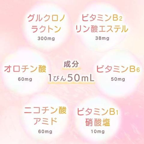 | 1瓶(50mL)中の成分 ビタミンB2リン酸エステル:38mg、ビタミンB6:50mg、ビタミンB1硝酸塩:10mg、ニコチン酸アミド60mg、オロチン酸:60mg、グルクロノラクトン:300mg 添加物として、安息香酸Na、クエン酸、クエン酸Na、パラベン、香料、アセスルファムK、エリスリトール、スクラロース、ステビア抽出物、没食子酸プロピル、DL-リンゴ酸、pH調整剤(アルコール0.1mL以下) ・本剤は内容成分が浮遊・沈殿することがありますが、効果には変わりありません。 ・本剤の服用により、尿が黄色くなることがありますが、これは本剤に含まれているビタミンB2が吸収され、その一部が尿中に排泄されるためで心配はありません。 |