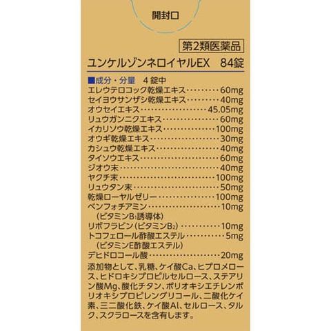 | 4錠中 エレウテロコック乾燥エキス:60mg セイヨウサンザシ乾燥エキス:40mg オウセイエキス:45.05mg リュウガンニクエキス:60mg イカリソウ乾燥エキス:100mg オウギ乾燥エキス:30mg カシュウ乾燥エキス:40mg タイソウエキス:60mg ジオウ末:40mg ヤクチ末:100mg リュウタン末:50mg 乾燥ローヤルゼリー:100mg ベンフォチアミン(ビタミンB1誘導体):10mg リボフラビン(ビタミンB2):10mg トコフェロール酢酸エステル(ビタミンE酢酸エステル):5mg デヒドロコール酸:20mg 添加物として、乳糖、ケイ酸Ca、ヒプロメロース、ヒドロキシプロピルセルロース、ステアリン酸Mg、酸化チタン、ポリオキシエチレンポリオキシプロピレングリコール、二酸化ケイ素、三二酸化鉄、ケイ酸Al、セルロース、タルク、スクラロースを含有します。 ★成分・分量に関連する注意 本剤はビタミンB2を含有するため、本剤の服用により、尿が黄色くなることがあります。 |