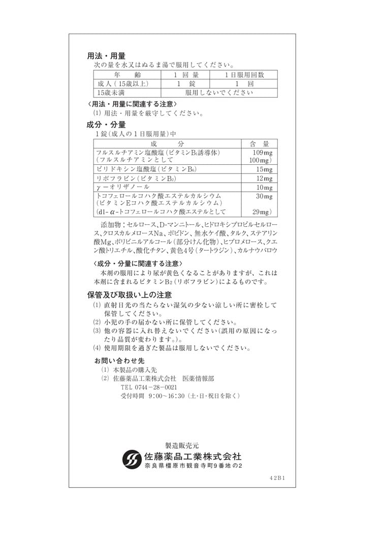 | 1錠(成人の1日服用量)中 [成分:含量] フルスルチアミン塩酸塩(ビタミンB1誘導体):109mg(フルスルチアミンとして:100mg) ピリドキシン塩酸塩(ビタミンB6):15mg リボフラビン(ビタミンB2)12mg γ-オリザノール:10mg トコフェロールコハク酸エステルカルシウム(ビタミンEコハク酸エステルカルシウム):30mg(dl-α-トコフェロールコハク酸エステルとして:29mg) 添加物:セルロース、D-マンニトール、ヒドロキシプロピルセルロース、クロスカルメロースNa、ポビドン、無水ケイ酸、タルク、ステアリン酸Mg、ポリビニルアルコール(部分けん化物)、ヒプロメロース、クエン酸トリエチル、酸化チタン、黄色4号(タートラジン)、カルナウバロウ ★成分・分量に関連する注意 本剤の服用により尿が黄色くなることがありますが、これは本剤に含まれるビタミンB2(リボフラビン)によるものです。 |