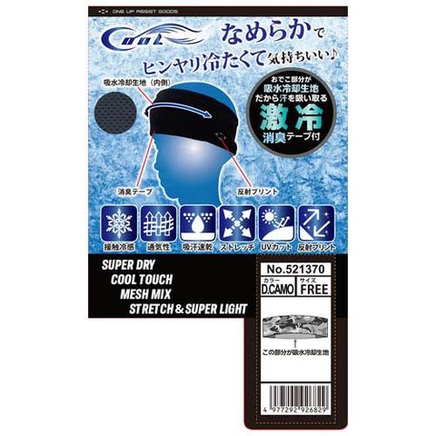 | カラー:ダークカモフラ。 サイズ:フリー。 ワンポイント反射プリント付。 (材質) 本体:ナイロン85%ポリウレタン15%。 タオル部:ポリエステル100%。 |