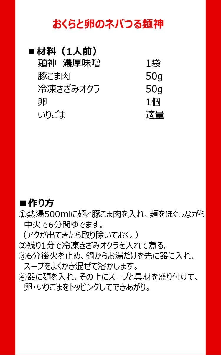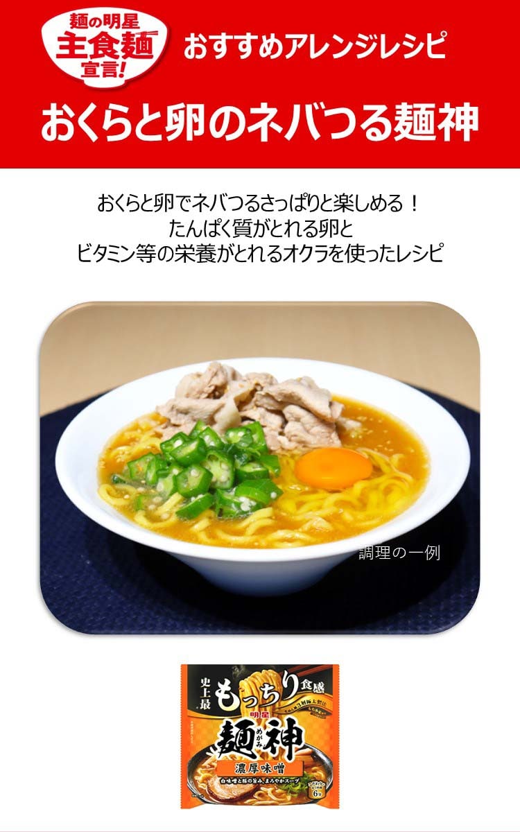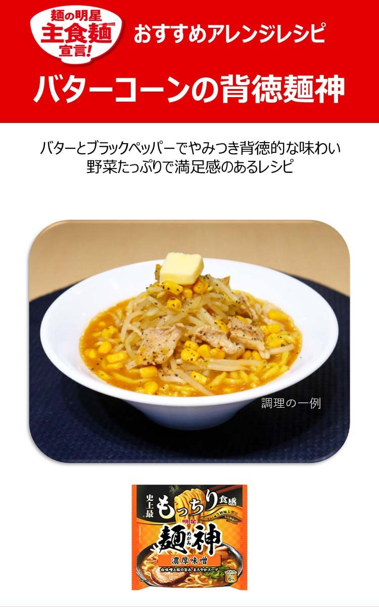 ●「麺の明星」最高峰の麺のブランドである「麺神」。「もち小麦」を配合することで実現した、「もっちり食感麺」。濃厚まろやか味噌スープともっちり麺でお店品質の一杯。