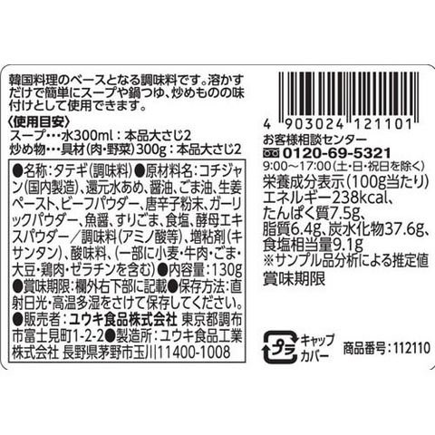 コチジャン(国内製造)、還元水あめ、醤油、ごま油、生姜ペースト、ビーフパウダー、唐辛子粉末、ガーリックパウダー、魚醤、すりごま、食塩、酵母エキスパウダー/調味料(アミノ酸等)、増粘剤(キサンタン)、酸味料、(一部に小麦・牛肉・ごま・大豆・鶏肉・ゼラチンを含む)