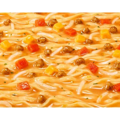 | 油揚げめん(小麦粉(国内製造)、植物油脂、精製ラード、でん粉、食塩、植物性たん白、砂糖、しょうゆ、チキンエキス、卵白)、 添付調味料(乳等を主要原料とする食品、粉末野菜、砂糖、食塩、豚脂、チキンエキス、香辛料、たん白加水分解物、植物油、パセリ)、 かやく(味付挽肉、チーズ加工品、たまねぎ、トマト加工品)/加工でん粉、調味料(アミノ酸等)、増粘多糖類、炭酸カルシウム、かんすい、クチナシ色素、カラメル色素、酸化防止剤(ビタミンE、ローズマリー抽出物)、 パプリカ色素、ベニコウジ色素、香料、ビタミンB2、ビタミンB1、(一部にえび・小麦・卵・乳成分・ごま・大豆・鶏肉・豚肉・ゼラチンを含む) |