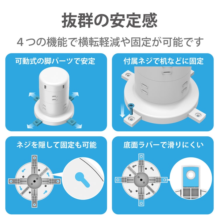 ●本体底面に収納された脚パーツを引き出すことで、接続したアダプタなどで重量バランスが偏っていても、安定して設置することができます。