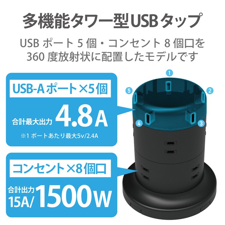 ●差込口8口とUSBポート5口が一体となったタワー形状のUSBタップです。